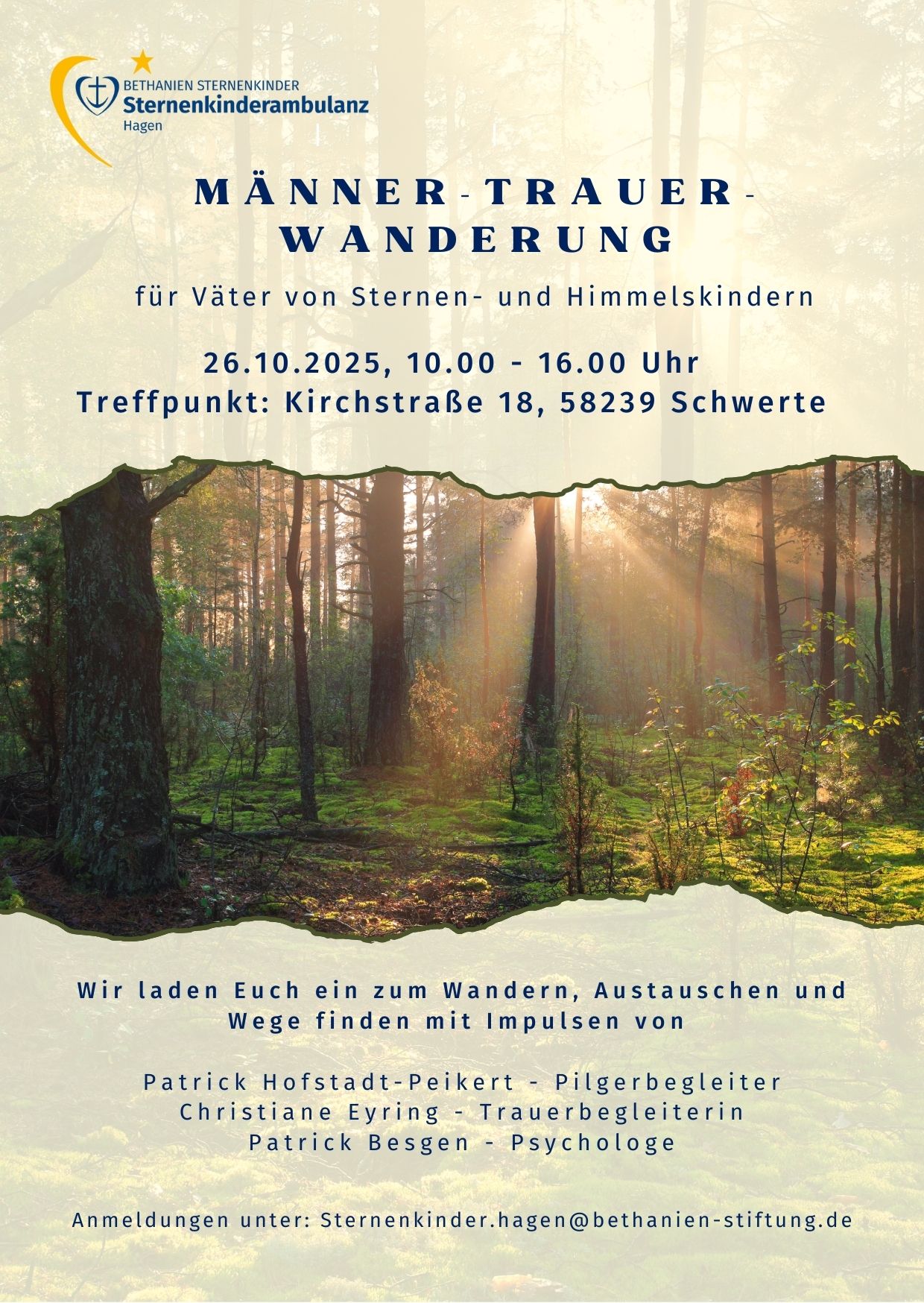 Immer am ersten Freitag eines Monats bieten wir einen offenen Gesprächskreis für, vom frühen Verlust eines Kindes betroffene Eltern und deren Angehörige an. Begleitet wird die Gruppe von der Krankenhausseelsorge des Agaplesion Klinikum Hagen, selbst betroffenen Müttern und einer Trauerbegleiterin der Bethanien Sternenkinderambulanz. Anmeldungen sind bis zum Vortag möglich.