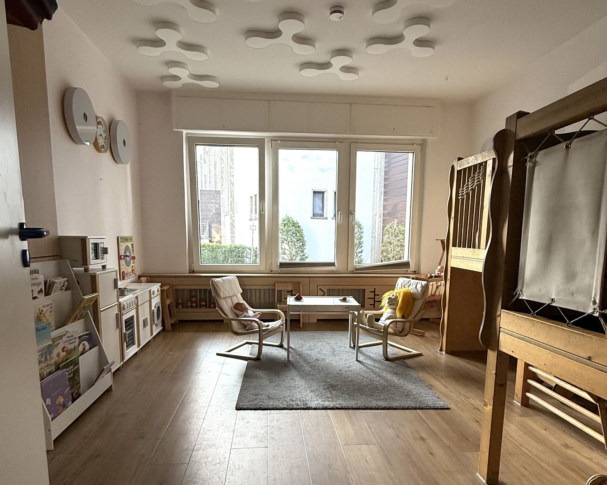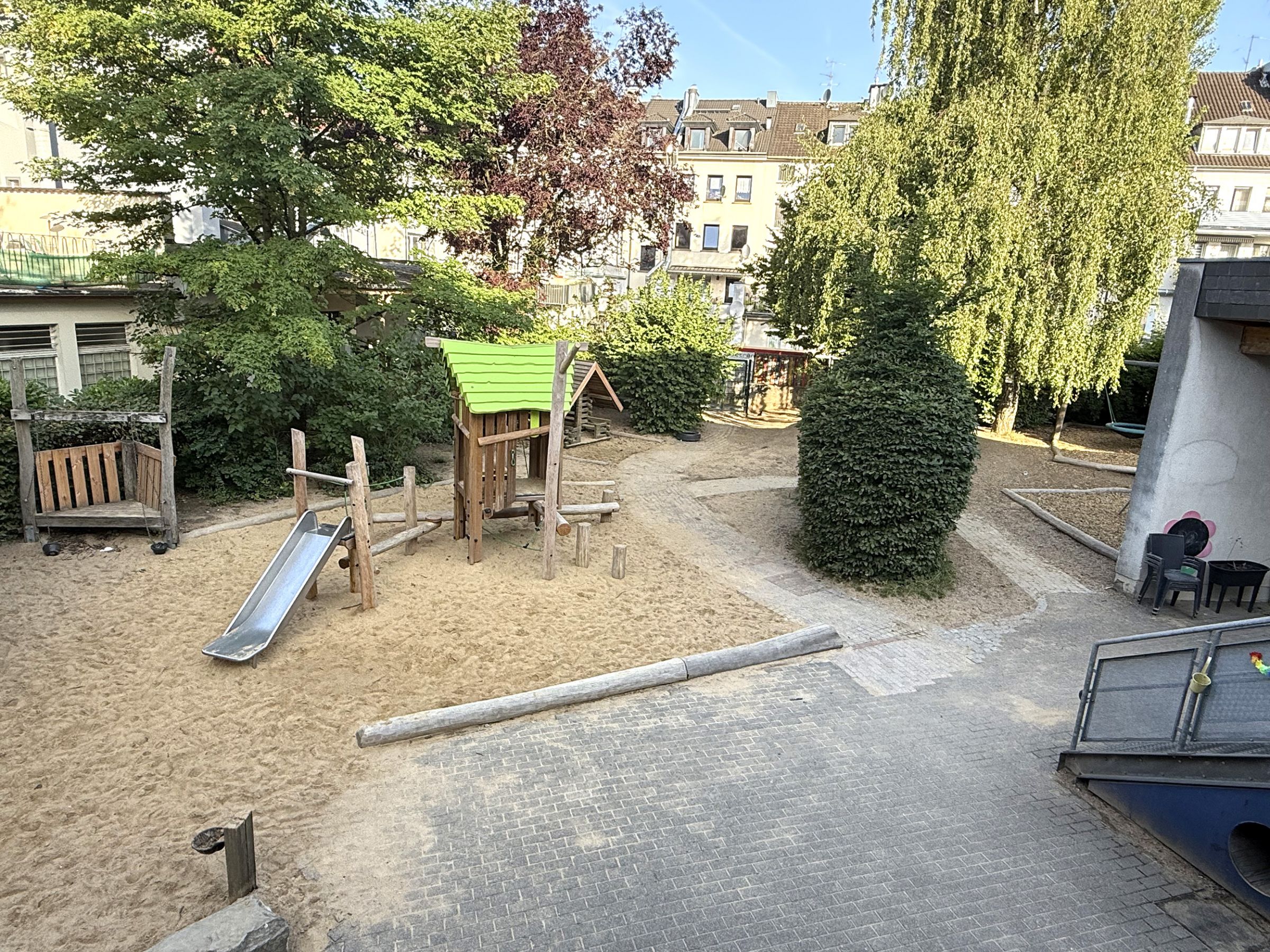 Die Kita Sternenhimmel befindet sich inmitten der Solinger Innenstadt. Trotz Stadtlage haben wir hinter dem Haus eine grüne Oase mit altem Baumbestand erhalten, in der die Kinder spielen und toben können.